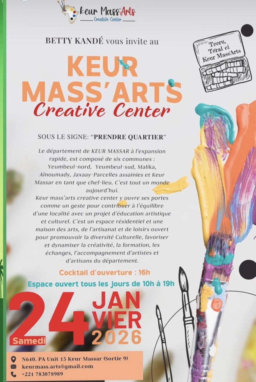 Keur Mass’Arts – Creative Center ouvre officiellement ses portes le samedi en janvier 2026, à Keur Massar, sous le signe « Prendre quartier », avec un cocktail d’ouverture à partir de 16h.