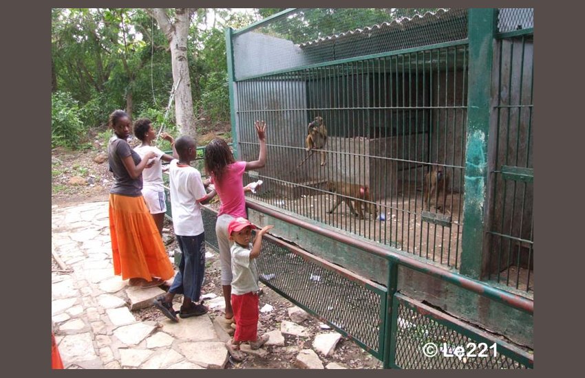 C’est sans doute le lieu le plus marquant du site. Pris entre un sentiment de crainte, de fascination et parfois d’amusement, on a le privilège d’y découvrir une centaine de pensionnaires (lions, tigre, pythons, autruches, aigle, crocodiles, chimpanzé, et même moutons eh oui !…) qui vivent dans des cages, fosses, enclos et volières.