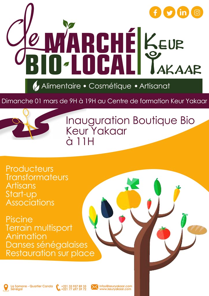 Tous ces produits sont disponibles dans la Boutique Bio Keur Yakaar qui sera inaugurée le dimanche 1 mars lors du premier Marché Bio Local Keur Yakaar, avec 35 exposants, des ateliers zéro déchets pour les enfants, des échanges sur les thématique de l’agro-écologie et la souveraineté alimentaire et une restauration bio sur place.
