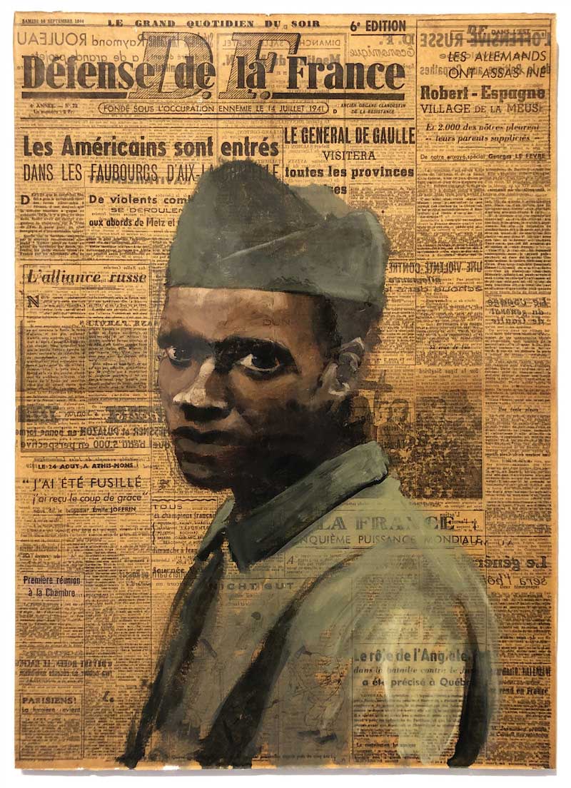 Roméo Mivekannin, Carte postale – type de tirailleur sénégalais, 2021, peinture acrylique et papier journal marouflé sur bois, traitement epoxy, 57 x 40 cm