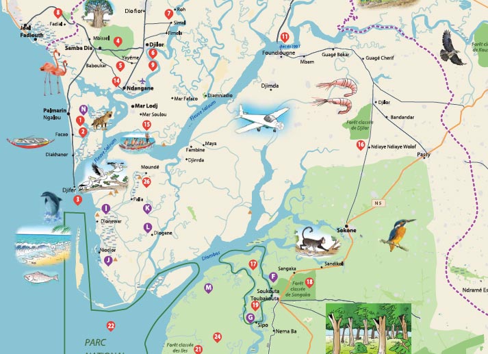 Pratique pour les voyageurs et touristes qui veulent découvrir la région, le plan du Saloum permet de se repérer facilement et donne des informations sur les principaux lieux à découvrir. Format ouvert : 66 x 48 cm.