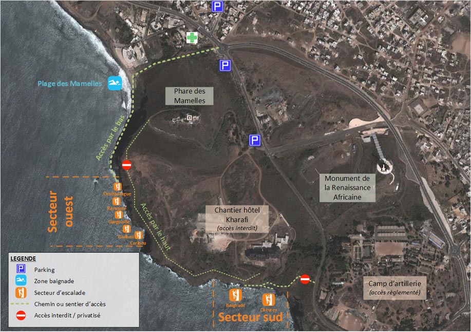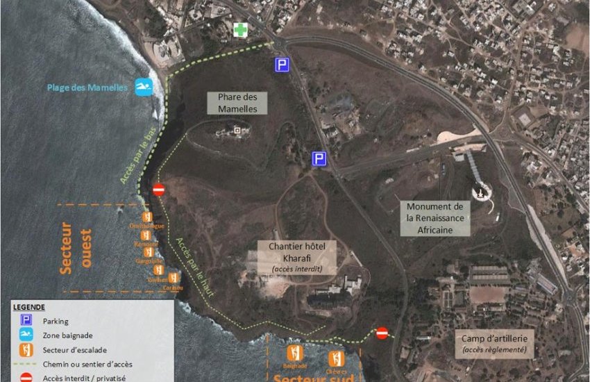 L’accessibilité du site naturel d’escalade des Mamelles à Dakar a toujours été difficile mais s’est encore fortement dégradée depuis la cession d’une partie du site à une société hôtelière (MA Kharafi & Sons) et la privatisation de la plaine du phare qui empêche dorénavant tout accès par le haut des falaises.