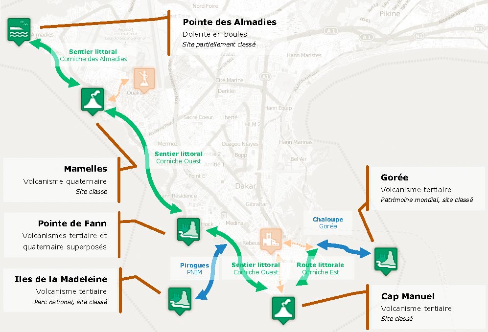 Ce sentier ferait partie intégrante du Géoparc de Dakar que souhaite mettre en œuvre l’Agence nationale de la recherche scientifique appliquée (ANRSA). Il vise à préserver et valoriser par une approche de gestion intégrée durable le littoral volcanique et les géosites remarquables de la presqu’ile du Cap Vert (corniche ouest, Mamelles, pointe des Almadies, parcs nationaux, zones humides).