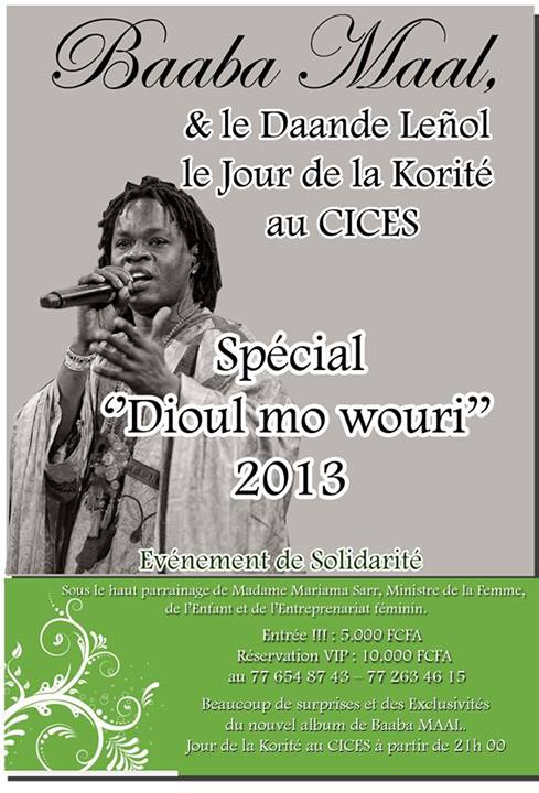 – Retrouvez BaabaMaal pour une spéciale Korité au CICES le Jeudi 08 aout à partir de 21h. Évènement placé sous le signe de la solidarité et parrainé par Mme MariamaSarr, ministre de la femme. http://agenda.au-senegal.com/baaba-...